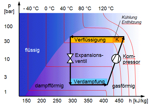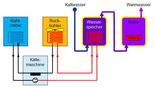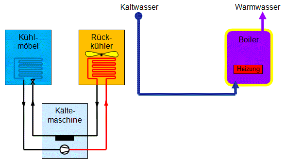 Der Kondensationskreis des Kompressors wird aufgetrennt und in der Zuleitung zum Kühler wird ein Wärmetauscher eingebaut. Dieser Wärmetauscher ist vorteilhaft direkt in einem Warmwasserspeicher eingebaut, dann wird keine Pumpe benötigt. Als Alternative kann der Wärmetauscher auch ausserhalb des Warmwasserspeichers sein. Der Warmwasserspeicher benötigt zwei zusätzliche Wasseranschlüsse und eine kleine Umwälzpumpe transportiert das Wasser von oben nach unten durch den Speicher.