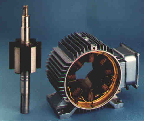 Beschreibung: Das Magnetfeld der an der Stromquelle angeschlossenen Wicklung des Stators induziert in den Wicklungen des Rotors eine Spannung, welche dann dort einen Stromfluss und damit ein Magnetfeld entstehen lässt. Üblicherweise ist die rotierende Wicklung kurzgeschlossen, es gibt aber Aufführungsformen mit einer elektrischen Verbindung (Schleifring) der Rotorwicklung mit der Stromquelle. Die Wicklung ist dreiphasig aufgeführt, damit der Motor anlaufen kann.