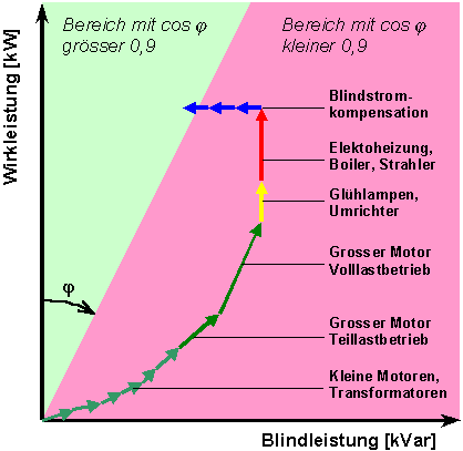 | Oberwellen | In Betrieben mit grossen Phasenanschnittgeräten (zum Beispiel Regelgeräte für Gleichstrommotoren) kann die Blindstromkompensationsanlage mit einem Oberwellenfilter kombiniert werden. | Motoren mit Frequenzumrichter benötigen keine Blindleistung vom Netz und erzeugen nur geringe Oberwellen. |