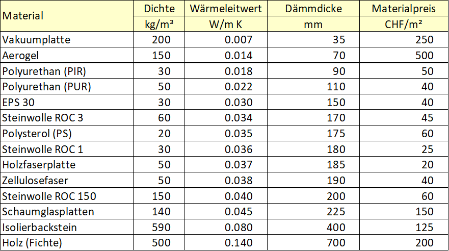 | Material | Dichte | Wärmewert | Wärmekapazität | Dampffestigkeit | Preis | Bemerkung |