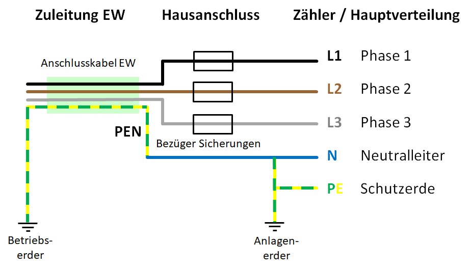 Mit einer 3-phasigen Stromversorgung kann kontinuierliche Leistung übertragen werden und die Übertragungsleitungen sind bei symmetrischer Last gleich ausgelastet. Das spezielle am Drehstrom ist, dass die Spannung zwischen 2 Phasen als Nennspannung bezeichnet wird, da diese auch bei fehlendem Null- oder Neutralleiter immer gemessen werden kann.
