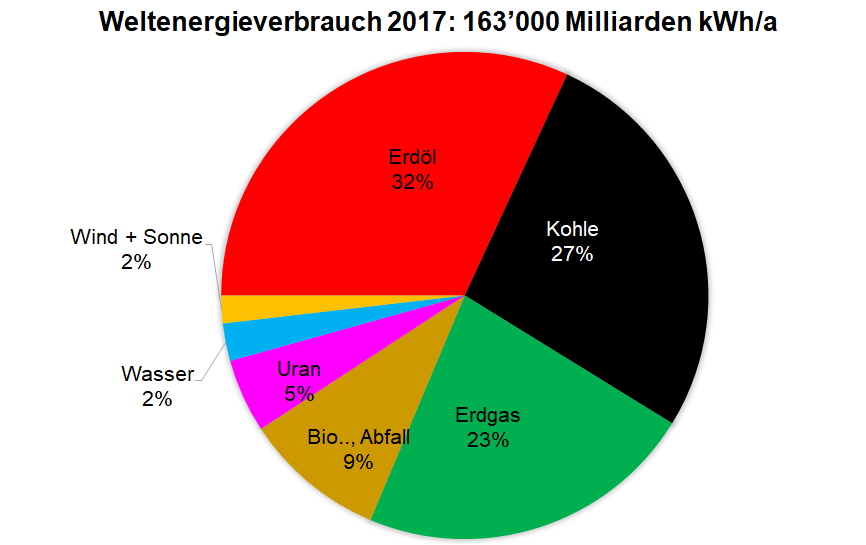 Der Verbrauch von technischer Primärenergie (Industrie, Stromerzeugung, Gebäudeheizung, Verkehr ...) betrug im Jahr 217 rund 163'000 Milliarden Kilowattstunden. Bei 8760 Stunden pro Jahr ergibt das eine durchschnittlichen Leistung von 18.6 Milliarden Kilowatt. Das ergibt pro Kopf der rund 7.5 Milliarden Menschen rund 2.5 Kilowatt Durchschnittsleistung. Im Jahr 1999 waren es noch 2 Kilowatt pro Person,