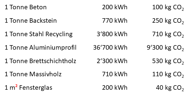 - 1 m3 Backstein (800 kg/m3) 620 kWh 200 kg CO2