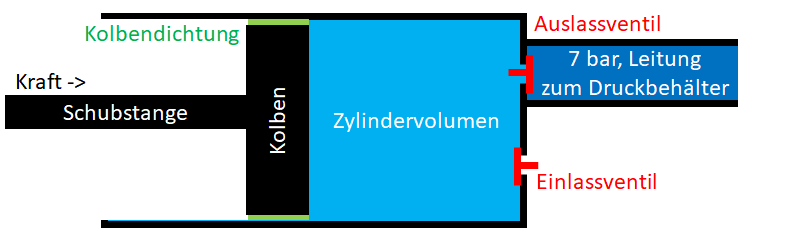 Die Urform eines Kompressors ist ein verschiebbarer Kolben in einen Zylinder. Je mehr das Gas zusammengedrückt wird, desto mehr Kraft ist erforderlich. Sobald das Auslassventil öffnet, nimmt die Kraft nicht mehr zu, wenn schon ein gleichgrosser Gegendruck herrscht. Das Volumen, welches das zurückbleibende Gas beim Aussstoss einnimmt, nennt man Totvolumen. Beim Rückhub wird über über das Einlassventil Gas mit Umgebungsdruck in den Zylinder angesaugt. Je nach den Strömungsverhältnissen startet die anschliessende Verdichtung dann mit einen kleinen Unterdruck im Zylindervolumen.