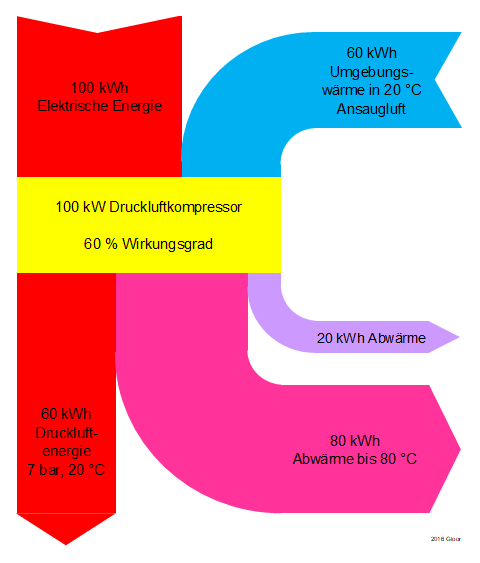 Wenn Gase komprimiert werden, erwärmen sie sich. Die Wärmemenge entspricht etwa der aufgewendeten mechanischen Energie für die Komprimierung (Gasgleichungen). Das scheint einen energetischen Widerspruch zu ergeben, denn mit der eingesetzten mechanischen Energie bekommt man die volle Wärme und zusätzlich viel komprimiertes Gas, welches fast soviel Arbeitsvermögen hat, wie mechanische Energie eingesetzt wurde. Um diesen Widerspruch aufzulösen, muss man die Grössen Energie und Exergie verwenden (Eine Begrifferklärung ist unter Thermodynamik zu finden).