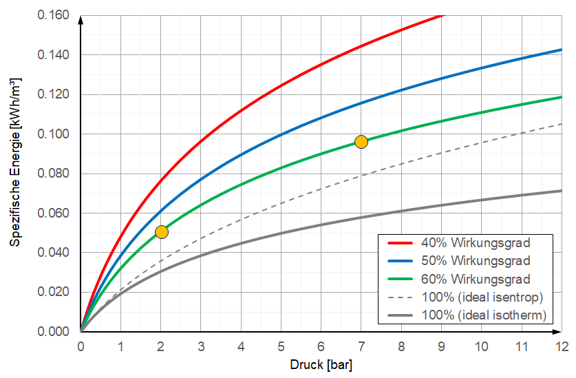 Um einen Kubikmeter Luft auf 7 bar Überdruck zu verdichten benötigt man im besten Fall etwa 0.1 kWh elektrische Energie. Das entspricht etwa der Energie, um einen Liter Wasser zum kochen zu bringen.