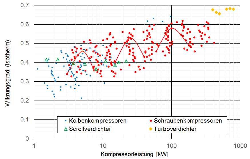 Wenn man die auf dem Markt erhältlichen Kompressoren vergleicht, sieht man, dass der Wirkungsgrad mit der Kompressorgrösse zunimmt. Erstaunlich ist auch die grosse Streuung der angebotenen Kompressoren, welche teilweise bei Faktor 2 liegt. Am Besten sind die Turboverdichter (Strömungsmaschinen), welche derzeit aber erst ab etwa 500 kW Leistung verfügbar sind. Die oft anzutreffende Meinung, dass Schraubenkompressoren besser als Kolbenkompressoren sind, wird durch die 4 Kolbenkompressoren im Bericht von 50 bis 100 kW widerlegt.