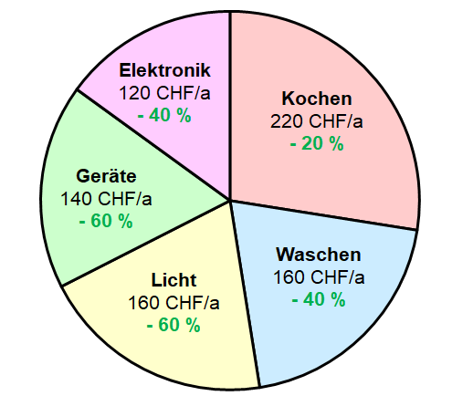 Ein sehr energieeffizienter 4-Personen Haushalt braucht 2000 kWh/a (400 CHF/a) und ein grosszügiger kann 8000 kWh/a (1600 CHF/a) beziehen. Verglichen mit den Kosten für die Krankenkasse, das Auto oder Telefon/Handy sind die Stromkosten für einen Haushalt nicht so gross.