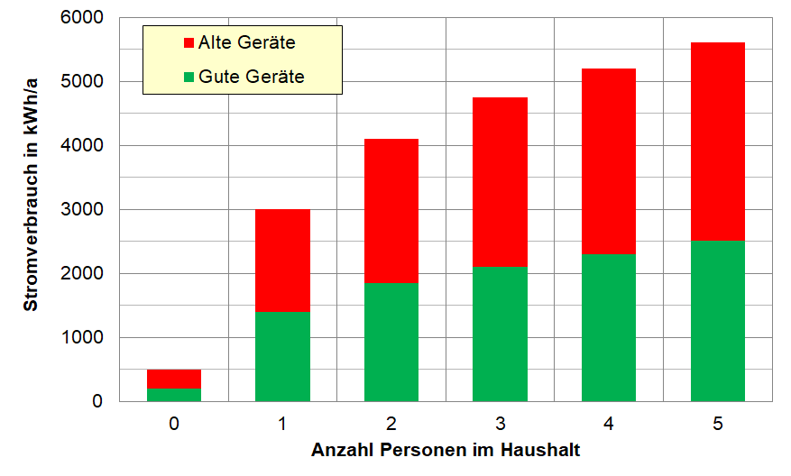 Ausgehend vom einem durchschnittlichen Nutzerverhalten (Anzahl Malzeiten, Waschgänge ...) und dem Einsatz der energieeffizientesten Geräte hat ein 4-Personen Haushalt einen Stromverbrauch von etwa 2400 kWh/a.