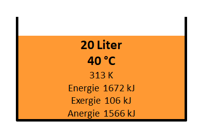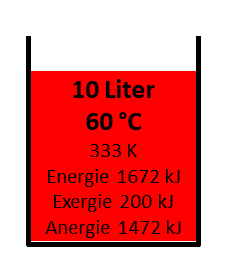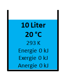 Im 10 Liter Behälter mit 20 °C besteht keine Differenz zur Umgebungstemperatur, aus diesem Grund hat er keinen Energieinhalt. Energie, Exergie und Anergie ist 0 kJ.