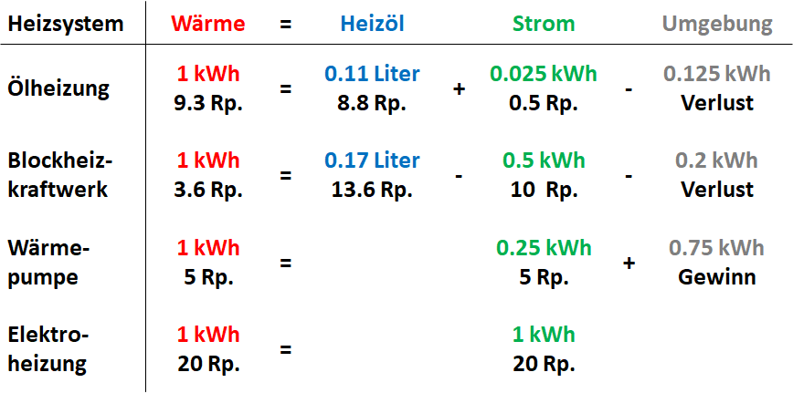 Mit Heizöl oder Erdgas kann man heizen und Strom machen. Mit Strom kann man auch heizen, über eine Wärmepumpe gibt es aber ein Mehrfaches an Wärme.